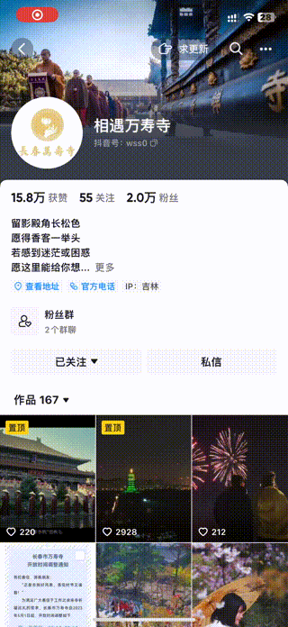 企業(yè)抖音藍(lán)V賬號(hào)展示——長春萬壽寺